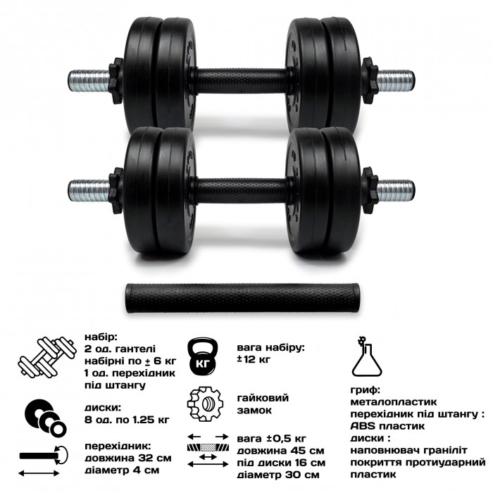 Гантелі розбірні 2х6 кг із перехідником під штангу в комплекті. Вага штанги 12 кг