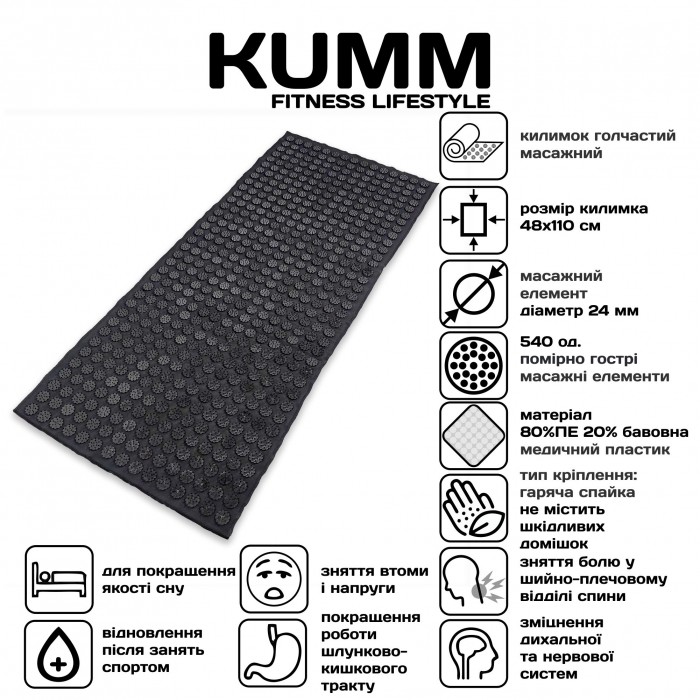 Немає відгуків про товар Килимок голчастий масажний акупунктурний KUMM 48×110 см 540 елементів чорний SF11921