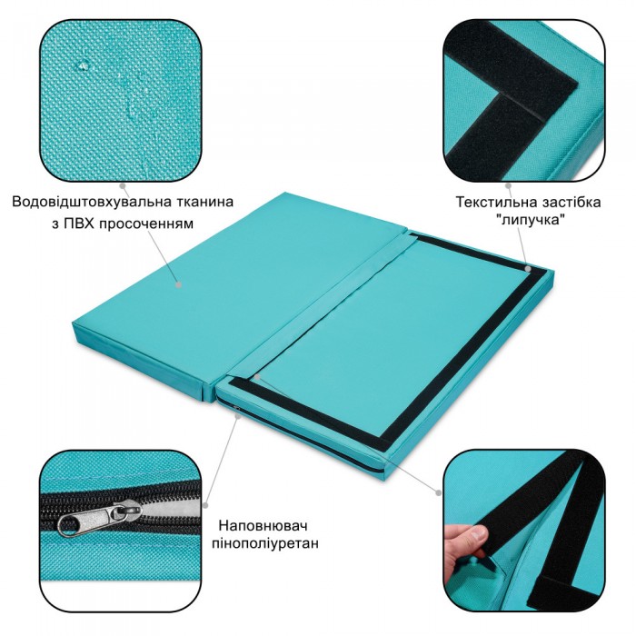 Чохол матів пошитий з міцної водовідштовхувальної тканини з внутрішнім ПВХ-просоченням. Наповнювач — пінополіуретан, який забезпечує хороші амортизаційні та теплоізоляційні властивості.