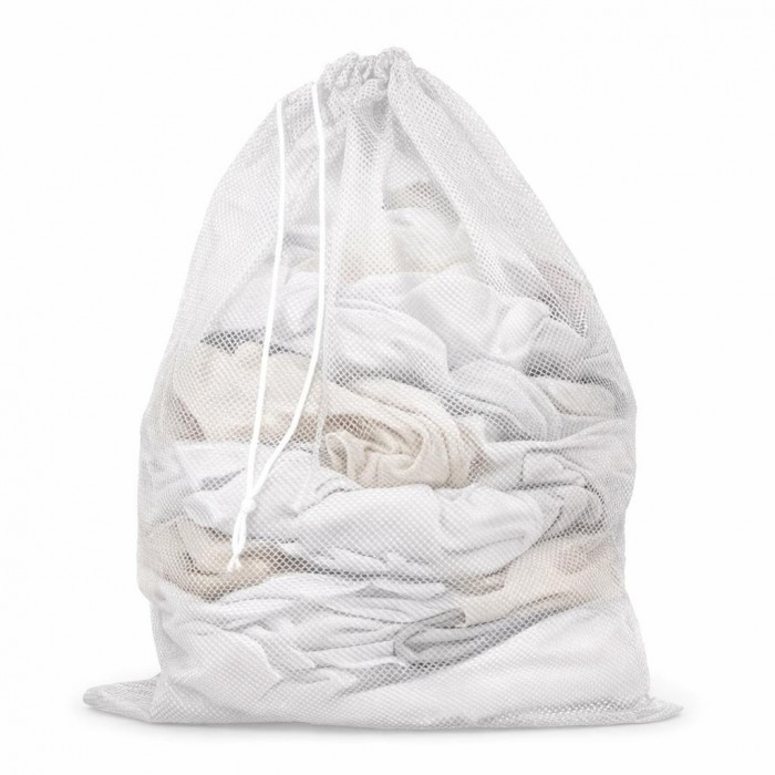 Мішок для прання розміром 68х60см білого кольору. Виготовлений з дрібної м'якої сітки, яка не линяє та не чіпляється за речі. Береже речі від зношування в процесі прання. Мішок для прання призначений для білизни та одягу. Підходить для прання делікатних виробів, дрібної білизни, речей з металевою фурнітурою, дитячих іграшок та взуття. Для зручного використання мішок для прання закривається зверху мотузкою, яка фіксується пластиковим фіксатором.