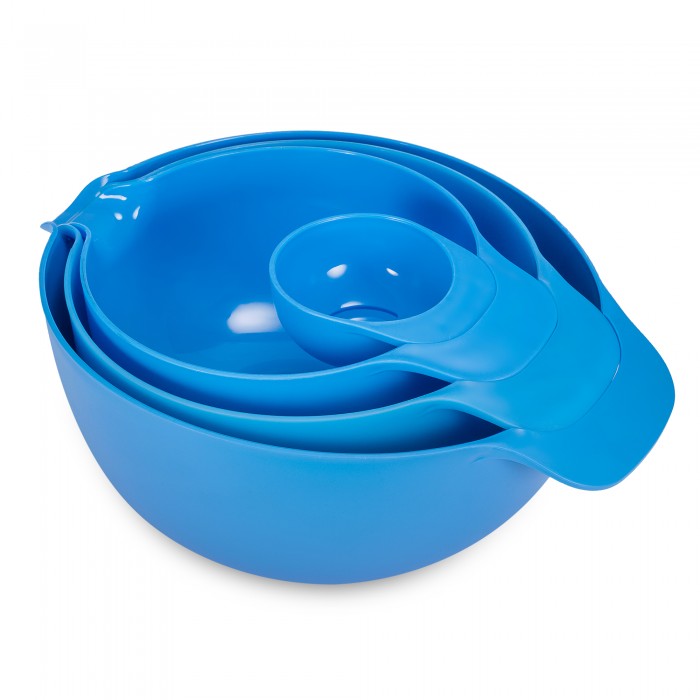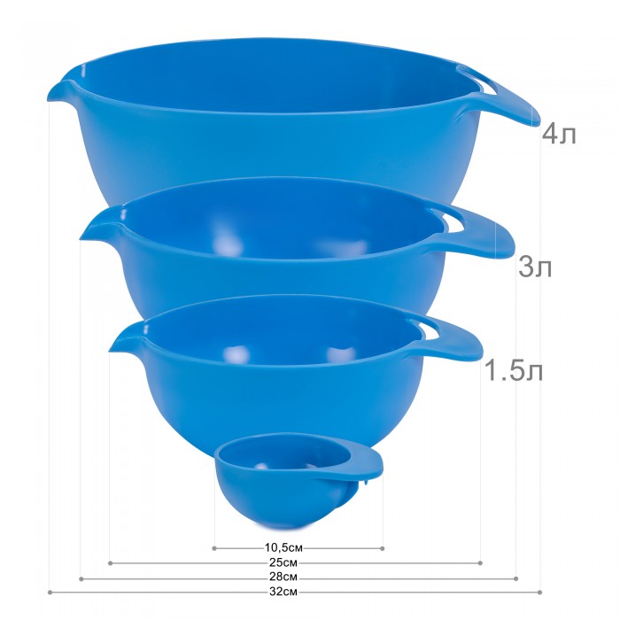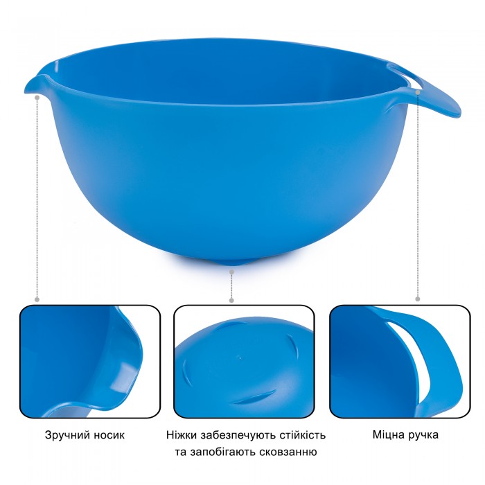 Три миски різного об'єму: 1.5л, 3л, 4л з отвіром для кріплення сепаратора, що відокремлює жовток від білка. Кут нахилу ручки підібраний спеціально так, щоб було максимально зручно переливати змішані інгредієнти. Миски виготовлені з високоякісного харчового пластику. Можливе використання в СВЧ печі. Підходять як для вінчика, так і для міксера. Дозволяється мити у посудомийній машині.
