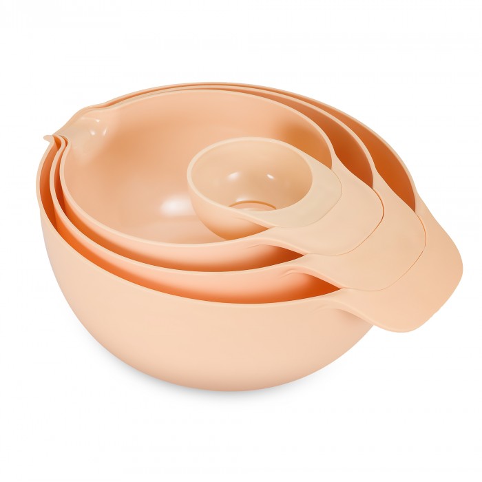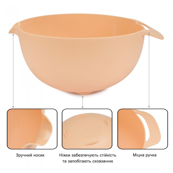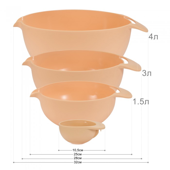 Три миски різного об'єму: 1.5л, 3л, 4л з отвіром для кріплення сепаратора, що відокремлює жовток від білка. Кут нахилу ручки підібраний спеціально так, щоб було максимально зручно переливати змішані інгредієнти. Миски виготовлені з високоякісного харчового пластику. Можливе використання в СВЧ печі. Підходять як для вінчика, так і для міксера. Дозволяється мити у посудомийній машині.