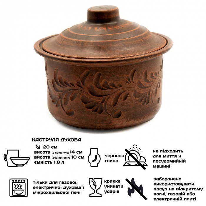 Ця кастрюля для духовки, виготовлений з натуральної червоної глини, стане ідеальним вибором для приготування страв у духовці. З діаметром 20 см, висотою з кришкою 14 см, без 10см, об'ємом 1.8 літра підходить для запікання м'яса, овочів, каш та інших домашніх страв. Натуральна глина сприяє рівномірному розподілу тепла, що допомагає зберегти соковитість та смак продуктів.