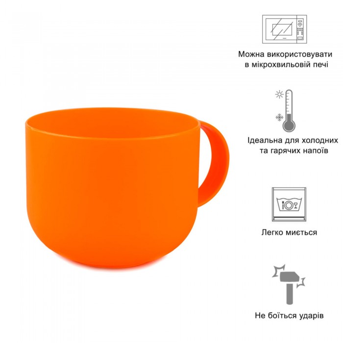 Чашка виготовлена з якісного харчового пластику, який не вбирає запахів і легко миється. Матеріал стійкий до ударів і подряпин, тому чашка не боїться падінь та активного використання в польових умовах. Її можна використовувати для гарячих і холодних напоїв, а також підігрівати у мікрохвильовій печі. Легка вага та зручна форма з ручкою роблять цю чашку ідеальною для походів, пікніків, подорожей, дачі або навіть для щоденного використання вдома чи в офісі.