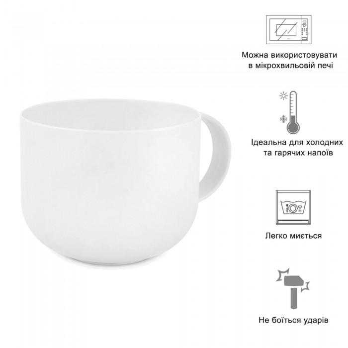 Чашка виготовлена з якісного харчового пластику, який не вбирає запахів і легко миється. Матеріал стійкий до ударів і подряпин, тому чашка не боїться падінь та активного використання в польових умовах. Її можна використовувати для гарячих і холодних напоїв, а також підігрівати у мікрохвильовій печі. Легка вага та зручна форма з ручкою роблять цю чашку ідеальною для походів, пікніків, подорожей, дачі або навіть для щоденного використання вдома чи в офісі.