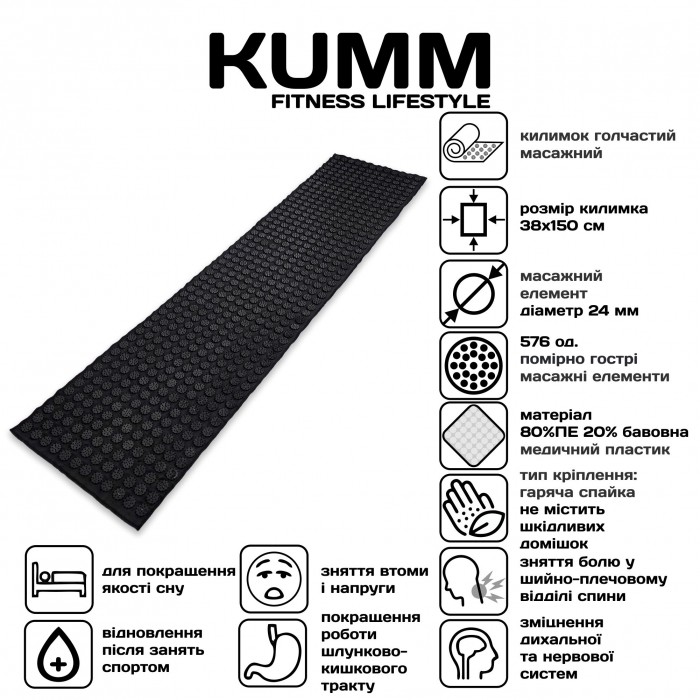 Коврик игольчатый массажный KUMM 38×150 см — удобный аксессуар для ежедневного расслабления и восстановления в домашних условиях. Благодаря большому размеру коврик подходит для комфортного использования во всю длину тела — для спины, шеи, плеч, поясницы и ног.