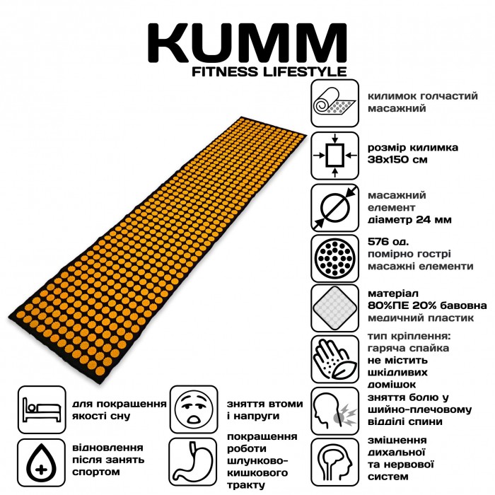 Коврик игольчатый массажный KUMM 38×150 см — удобный аксессуар для ежедневного расслабления и восстановления в домашних условиях. Благодаря большому размеру коврик подходит для комфортного использования во всю длину тела — для спины, шеи, плеч, поясницы и ног.