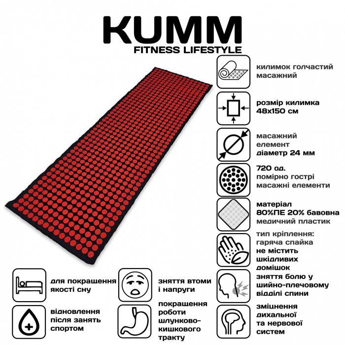 Коврик игольчатый массажный KUMM 48×150 см — удобный аксессуар для ежедневного расслабления и восстановления в домашних условиях. Благодаря большому размеру коврик подходит для комфортного использования во всю длину тела — для спины, шеи, плеч, поясницы и ног.