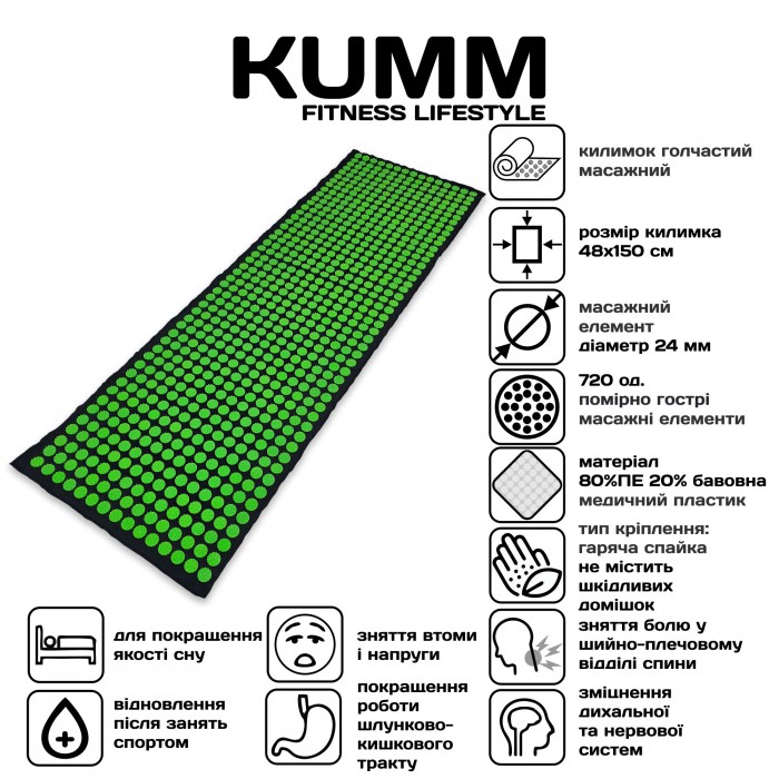 Коврик игольчатый массажный KUMM 48×150 см — удобный аксессуар для ежедневного расслабления и восстановления в домашних условиях. Благодаря большому размеру коврик подходит для комфортного использования во всю длину тела — для спины, шеи, плеч, поясницы и ног.