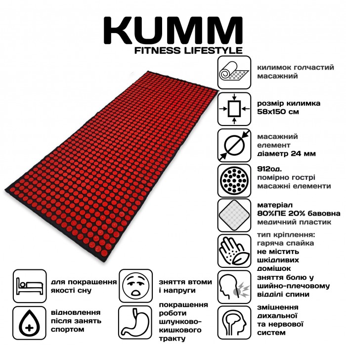 Коврик игольчатый массажный KUMM 58×150 см — удобный аксессуар для ежедневного расслабления и восстановления в домашних условиях. Благодаря большому размеру коврик подходит для комфортного использования во всю длину тела — для спины, шеи, плеч, поясницы и ног.