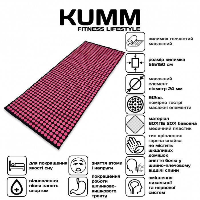 Коврик игольчатый массажный KUMM 58×150 см — удобный аксессуар для ежедневного расслабления и восстановления в домашних условиях. Благодаря большому размеру коврик подходит для комфортного использования во всю длину тела — для спины, шеи, плеч, поясницы и ног.