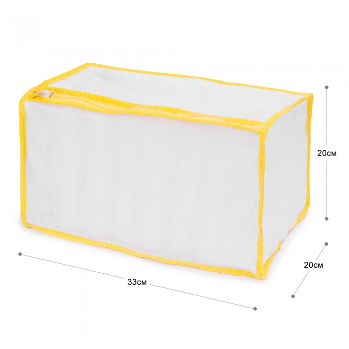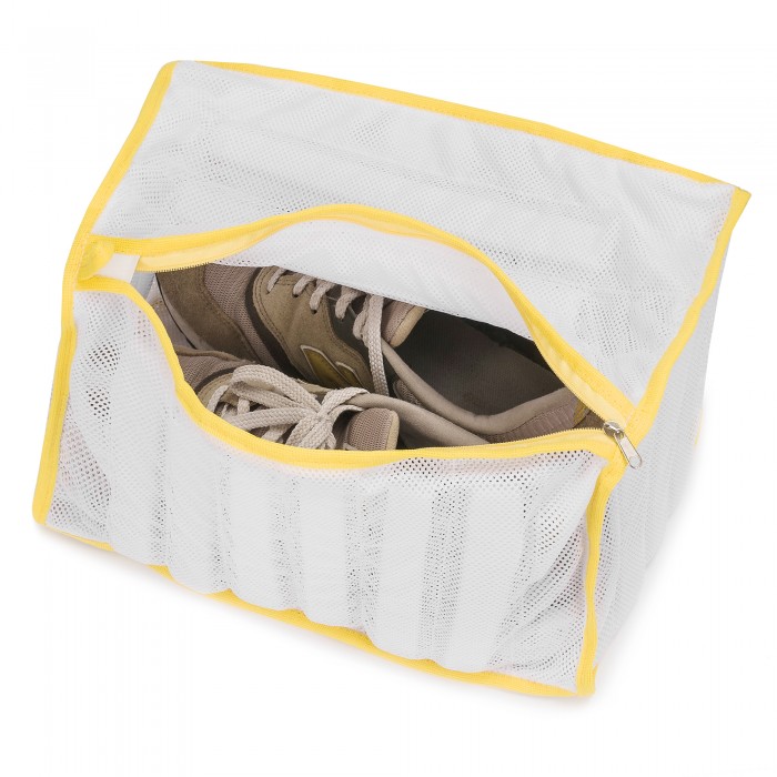 Мешок для стирки (длина 33см, ширина и высота 20см) бело-желтого цвета пошит из мелкой мягкой сетки, которая не линяет и не цепляется за вещи. Предназначен для стирки обуви в стиральной машине. Оборудован специальными амортизирующими вставками, позволяющими вернуть свежесть обуви без рисков повредить обувь или барабан стиральной машины. Предохраняет от попадания мелких деталей в сливной механизм, снижает шум, повышает качество стирки. Закрывается мешок для стирки обуви застёжкой - молния. Для подвешивания после стирки - оборудован петлёй.