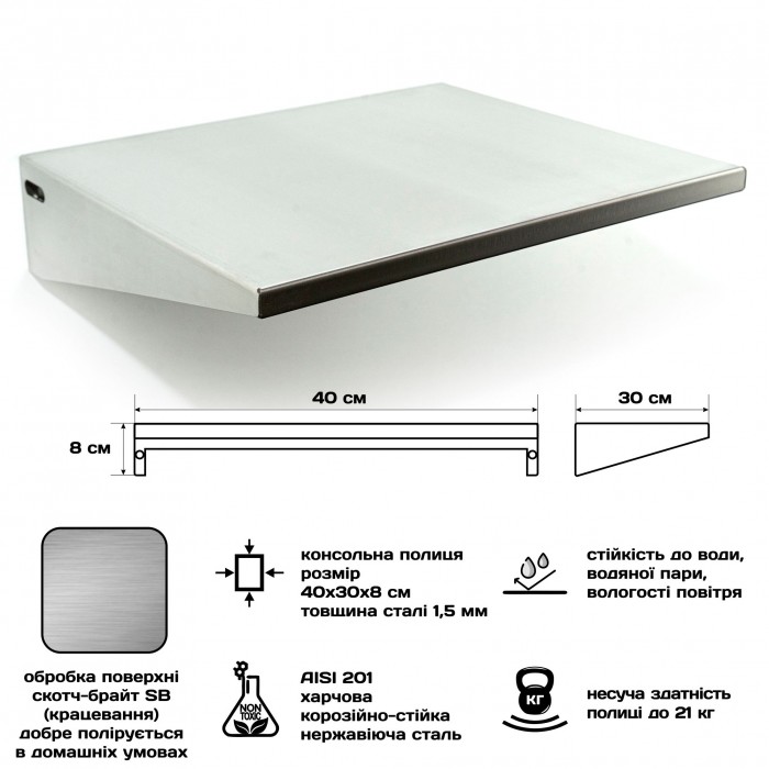 Усиленная консольная настенная полка из нержавеющей стали размером 40×30×8 см — надежное и практичное решение для профессиональных кухонь, кафе, ресторанов, а также для дома и хозяйственных помещений. Изготовлена из пищевой нержавеющей стали AISI 201 толщиной 1,5 мм, что обеспечивает прочность и устойчивость к влаге, пару и коррозии. Рабочая нагрузка до 21 кг позволяет безопасно хранить посуду, инвентарь, продукты или инструменты.