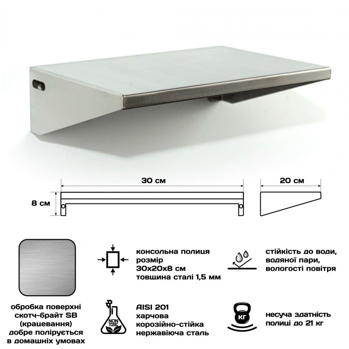Усиленная консольная настенная полка из нержавеющей стали размером 30×20×8 см — надежное и практичное решение для профессиональных кухонь, кафе, ресторанов, а также для дома и хозяйственных помещений. Изготовлена из пищевой нержавеющей стали AISI 201 толщиной 1,5 мм, что обеспечивает прочность и устойчивость к влаге, пару и коррозии. Рабочая нагрузка до 21 кг позволяет безопасно хранить посуду, инвентарь, продукты или инструменты.