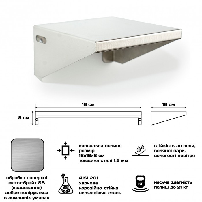 Усиленная консольная настенная полка из нержавеющей стали размером 16×16×8 см — надежное и практичное решение для профессиональных кухонь, кафе, ресторанов, а также для дома и хозяйственных помещений. Изготовлена из пищевой нержавеющей стали AISI 201 толщиной 1,5 мм, что обеспечивает прочность и устойчивость к влаге, пару и коррозии. Рабочая нагрузка до 21 кг позволяет безопасно хранить посуду, инвентарь, продукты или инструменты.