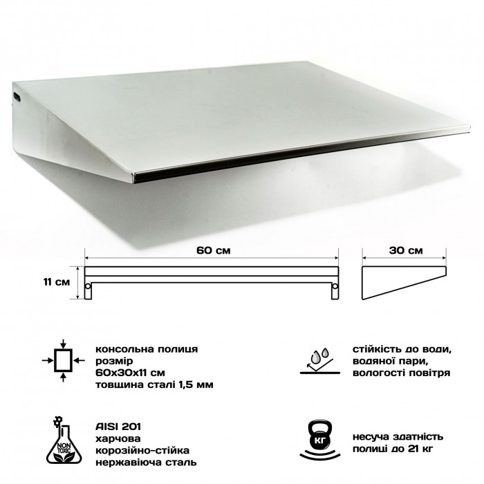 Усиленная консольная настенная полка из нержавеющей стали размером 60×30×11 см — надежное и практичное решение для профессиональных кухонь, кафе, ресторанов, а также для дома и хозяйственных помещений. Изготовлена из пищевой нержавеющей стали AISI 201 толщиной 1,5 мм, что обеспечивает прочность и устойчивость к влаге, пару и коррозии. Рабочая нагрузка до 21 кг позволяет безопасно хранить посуду, инвентарь, продукты или инструменты.