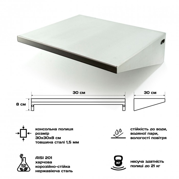 Усиленная консольная настенная полка из нержавеющей стали размером 30×30×8 см — надежное и практичное решение для профессиональных кухонь, кафе, ресторанов, а также для дома и хозяйственных помещений. Изготовлена из пищевой нержавеющей стали AISI 201 толщиной 1,5 мм, что обеспечивает прочность и устойчивость к влаге, пару и коррозии. Рабочая нагрузка до 21 кг позволяет безопасно хранить посуду, инвентарь, продукты или инструменты.