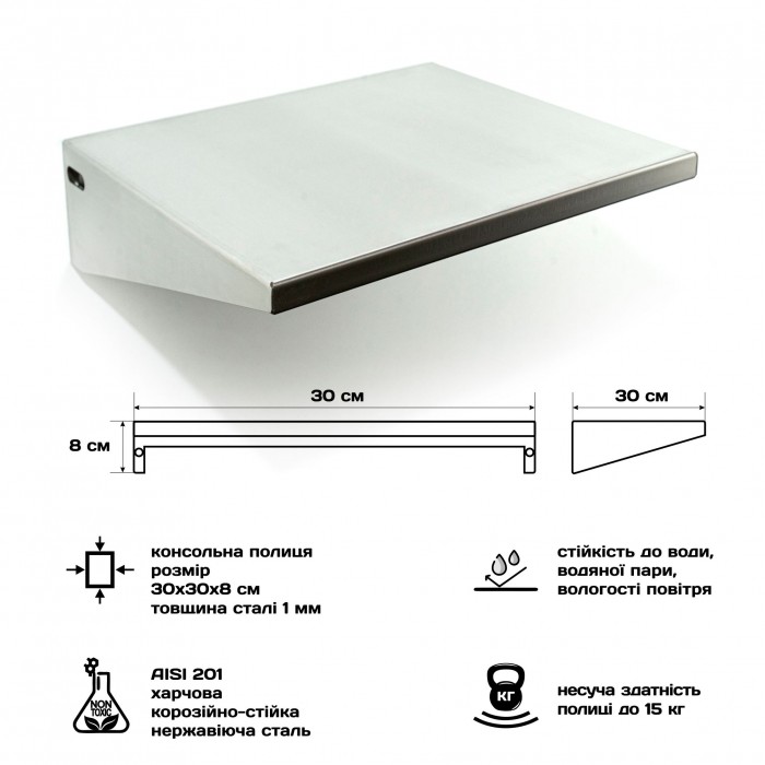 Консольная настенная полка из нержавеющей стали размером 30×30×8 см — надежное и практичное решение для профессиональных кухонь, кафе, ресторанов, а также для дома и хозяйственных помещений. Изготовлена из пищевой нержавеющей стали AISI 201 толщиной 1 мм, что обеспечивает прочность и устойчивость к влаге, пару и коррозии. Рабочая нагрузка до 15 кг позволяет безопасно хранить посуду, инвентарь, продукты или инструменты.