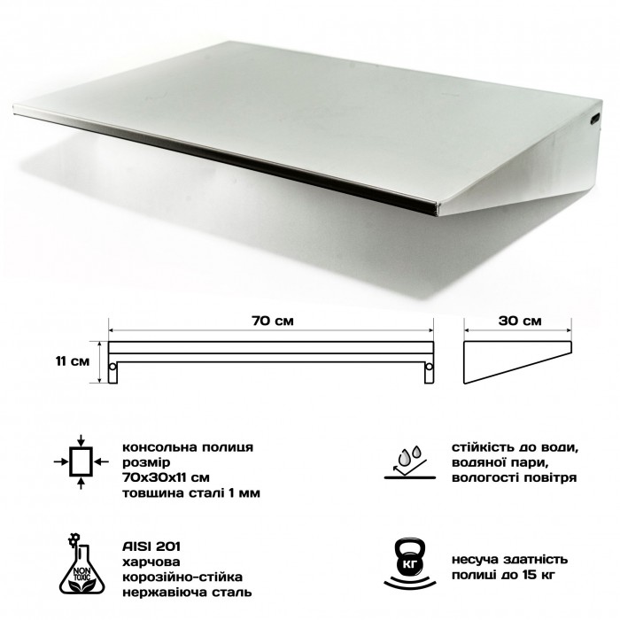 Консольная настенная полка из нержавеющей стали размером 70×30×11 см – надежное и практичное решение для профессиональных кухонь, кафе, ресторанов, а также для дома или хозяйственных помещений. Изготовлена из пищевой нержавеющей стали AISI 201 толщиной 1 мм, что обеспечивает прочность и прочность влаги, пара и коррозии. Рабочая нагрузка до 15 кг позволяет безопасно хранить посуду, инвентарь, продукты или инструменты.